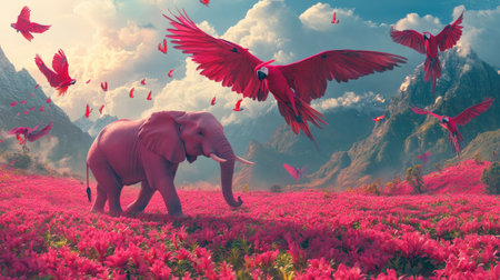 A stunning depiction of an elephant in a vibrant pink landscape, accompanied by flying pink birds, creating a surreal and dreamlike atmosphere of nature.