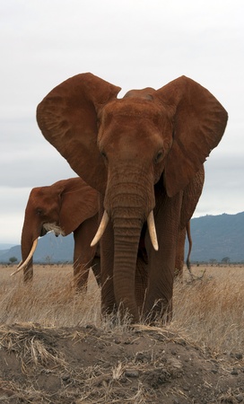 Close up photo of red African elephant in Africa. It is a wildlife photo of Tsavo East National park, Kenya.