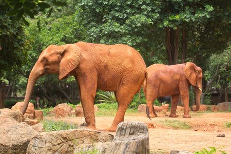 Two adult Elephants, Loxdonta Africana, walking on red sand. Back view. Safari game drive in Madikwe Reserve, South Africa, near Botswana and Kalahari Desert. The African Elephant is part of Big Five.
