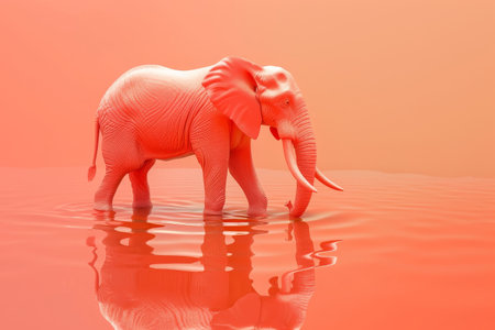 A pink elephant is walking in a pink body of water. The pink elephant is the main focus of the image, and the pink water creates a vibrant and playful atmosphere