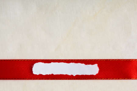 Piece scrap of white torn or ripped paper banner, blank copy space for text message red ribbon bright cloth background
