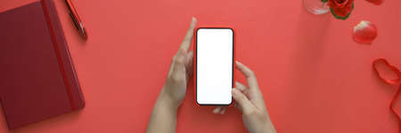 Top view of a woman holding blank screen smartphone while sitting at creative workspace with diary notebook and roses on pink table