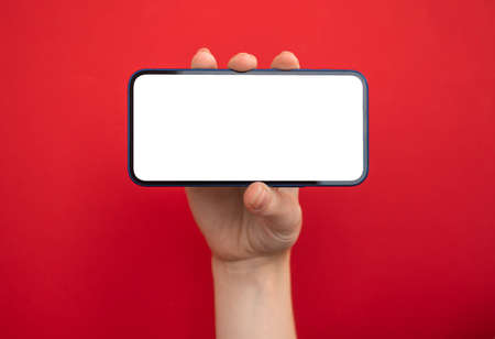 Mobile phone mockup horizontally screen on red color background, copy space