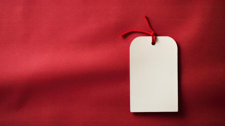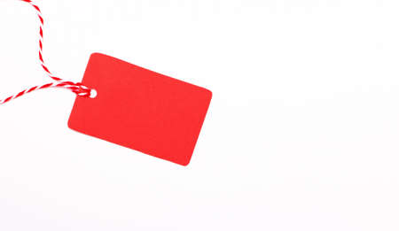 Red rectangular empty price tag with place to insert text on a string on a white background. copy space