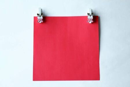 Christmas backdrop with wooden clothespins and red square copy space background. New Year festive object. Banner, greeting card, poster template. Figures of bear and deer