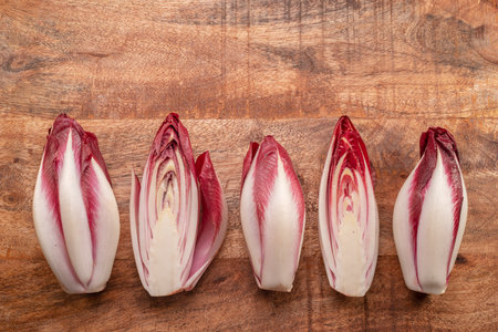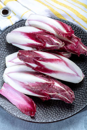 Group of fresh red Radicchio chicory or Belgian endive vegetables, also known as witlof salade, close up