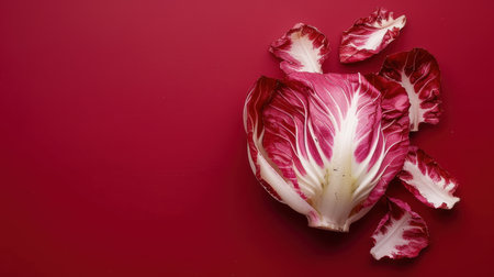 A single, vibrant head of radicchio sits on a deep red background, its ruffled leaves unfurling in a captivating display of crimson and white. The light catches the edges of each leaf, highlighting their intricate textures and creating a sense of delicate beauty. Scattered around the main head are several smaller leaves, adding a touch of whimsy to the composition.