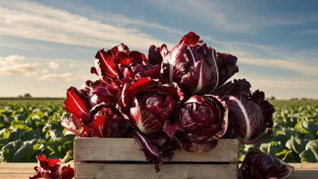 AI Generated. Freshly harvested radicchio in crate under sun field background