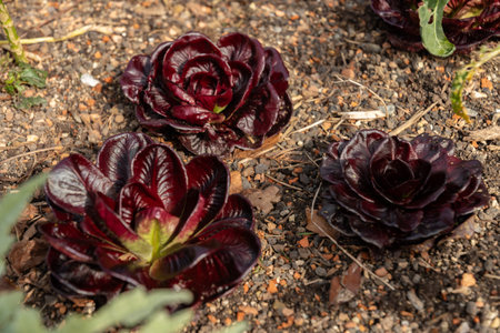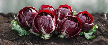 AI Generated. Fresh vibrant radicchio heads on dark soil in a garden bed