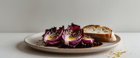 AI Generated. Plate of grilled radicchio drizzled balsamic vinegar and olive oil served with crusty bread
