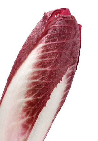 A single radicchio leaf, isolated on a white background, emphasizing a colorful leafy vegetable