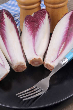 Fresh organic Belgian endivi or bitter green and red chicory lettuce close up