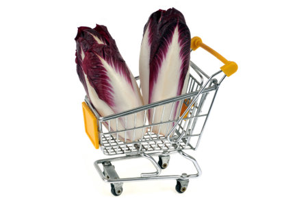 Two-colored endives in a supermarket trolley close-up on a white background | Two-colored endives in a supermarket cart