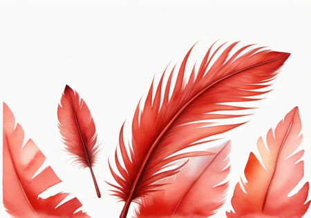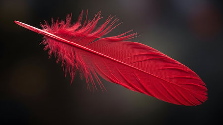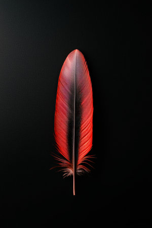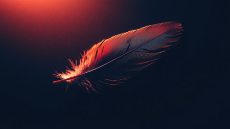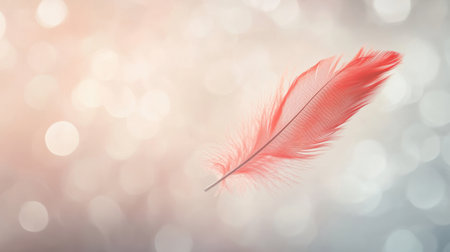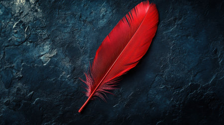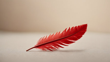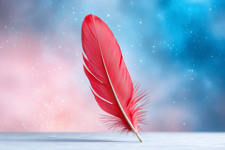 A vibrant red feather stands elegantly against a dreamy background of soft blue and pink hues, creating a striking visual effect perfect for artistic projects.