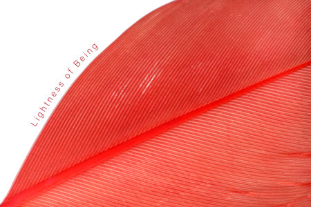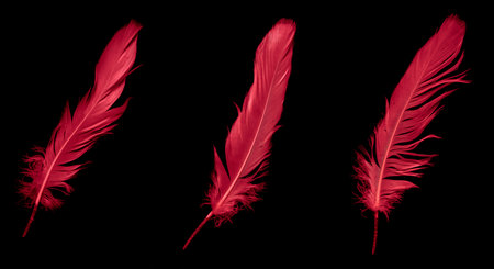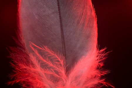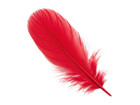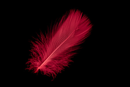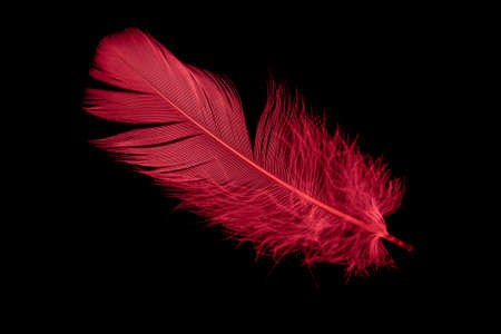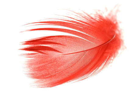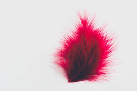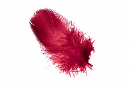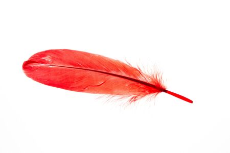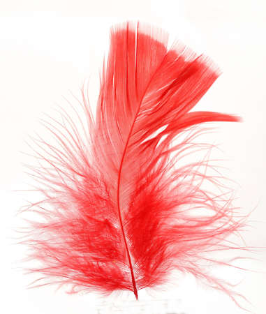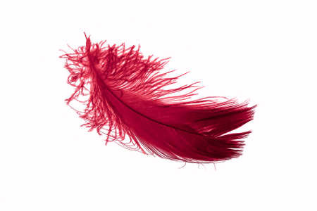 Close-up studio photography view of a soft red ostrich feather and quill on a white background