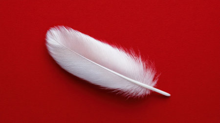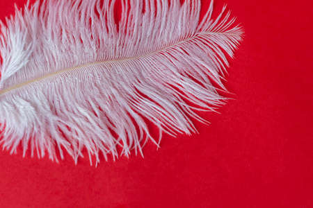 White, large, ostrich feather on a red background. Red background with a pen. Creative, design, design.
