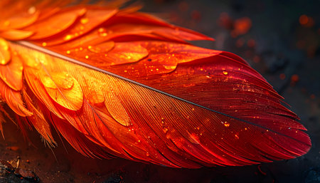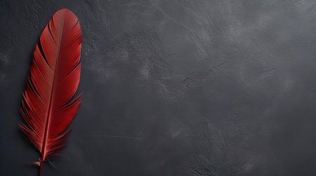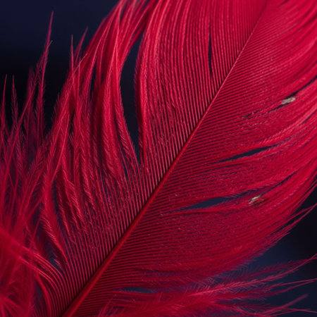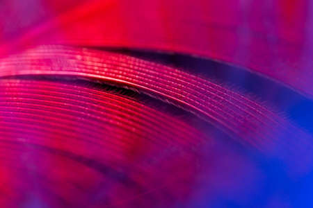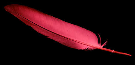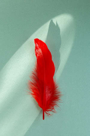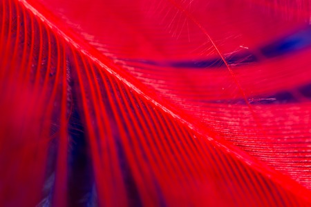 Red artificial feather close up. Exotic, tropical bird wing feather on pink background. Fashion, ornithology magazine cover concept. Macro accessories, clothes decoration texture