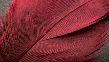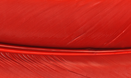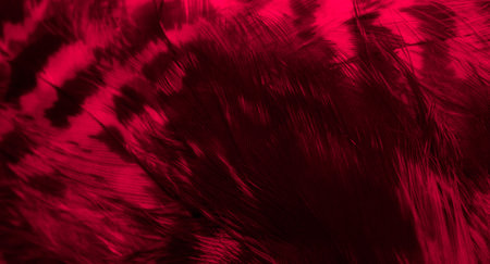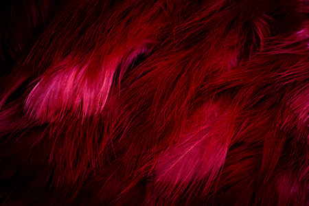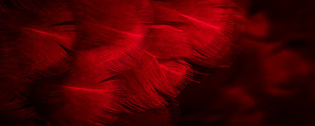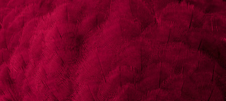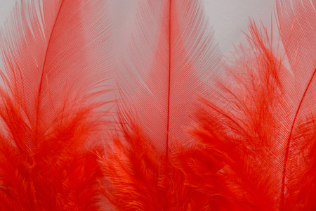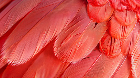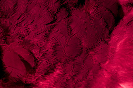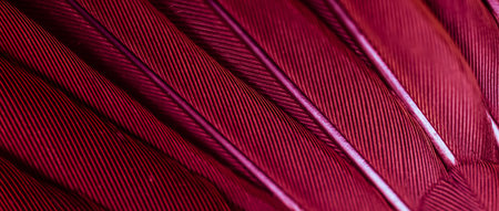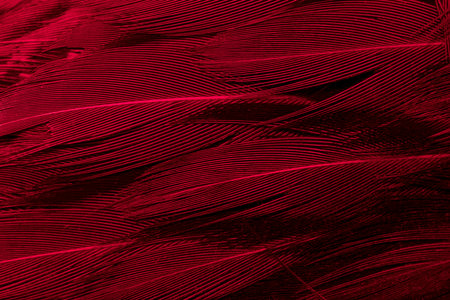 Beautiful background of red tropical birds feathers. Bird natural pattern. Close-up top view. Abstract shot.