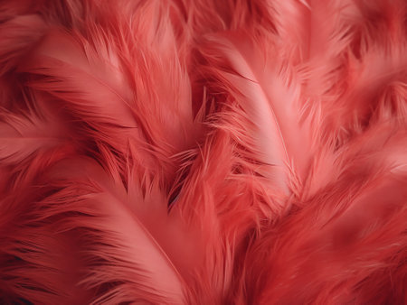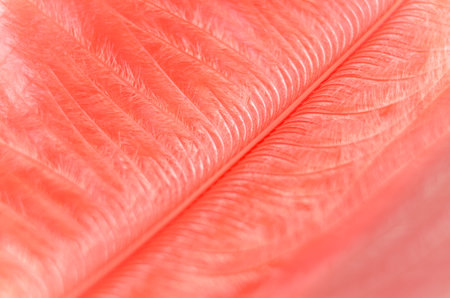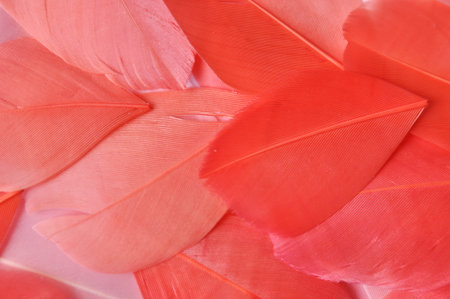 Real feathers trend color living coral closeup. Color of the year 2019 Pattern for your Design. top view