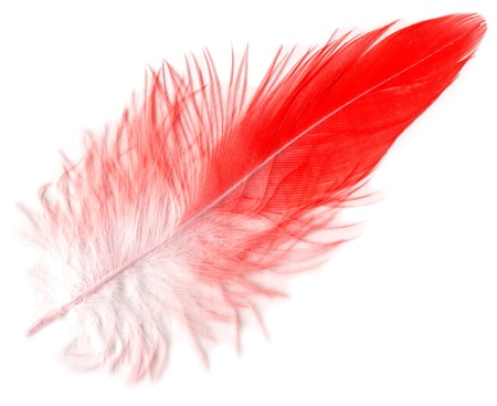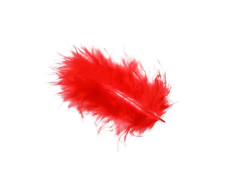 Close up one fluffy red down feather isolated on white background, elevated top view, directly above