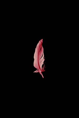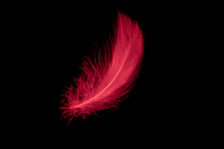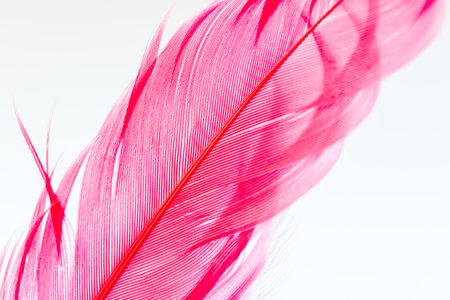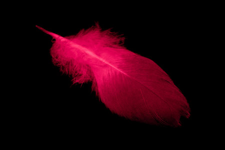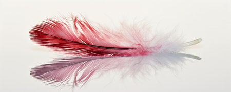 A pink feather with a red tip. The feather is very thin and delicate. The pink color of the feather is very striking and stands out against the white background