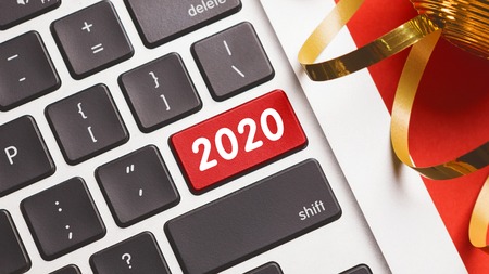 Keyboard with 2020 button and gold tincel. Happy new year concept
