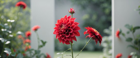 AI Generated. Red Dahlia Bloom in Garden Setting with Blurred Background and Floral Design