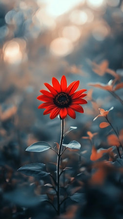 A single red sunflower with a dark center, standing tall on a thin stem with leaves, against a soft and dreamy blurred, bokeh-filled background, vertical photo.