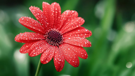 A single red flower with water droplets glistening on its petals, surrounded by blurred green foliage in the background.