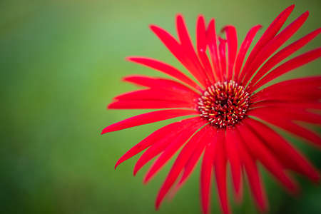 A Red Gerbera flower in full bloom with green background and empty space on top for writing a message