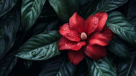 Delicate red ginger flower with water drops on its glossy petals, surrounded by lush green leaves, tropical aesthetic generative ai