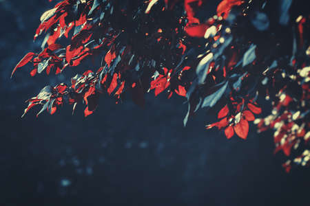 Beautiful autumn nature background with colorful leaves on branch in soft focus. Abstract. Vintage toning