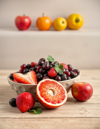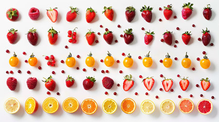 Array of vibrant fruits and berries displayed in an enticing pattern on a neutral white surface