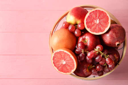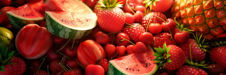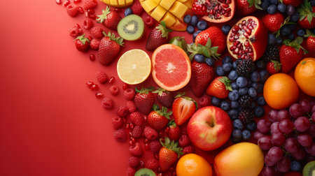 Colorful summer fruits on red background, studio lighting, refreshing and bright,