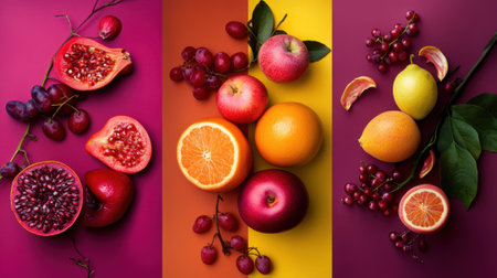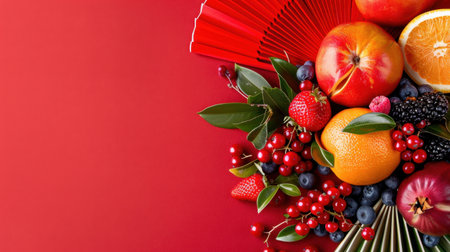 A striking composition featuring assorted fresh fruits such as oranges, strawberries, and blueberries, beautifully arranged with decorative leaves on a vivid red background.