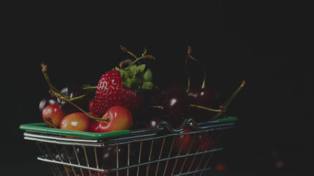 Red fresh strawberries and cherries in a little trolley from a super layout. Fruits in a little trolley.