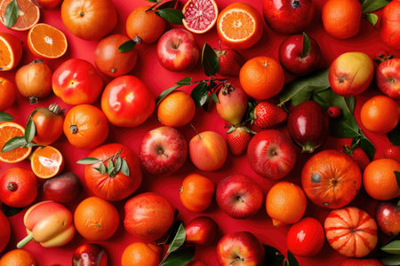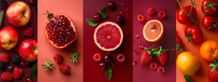 A collection of fresh, ripe fruits in shades of red and orange are arranged on a vibrant crimson background.