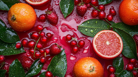 Close-up of oranges, strawberries, and red berries floating in vibrant red juice, with dewy green leaves creating a fresh and appetizing composition.