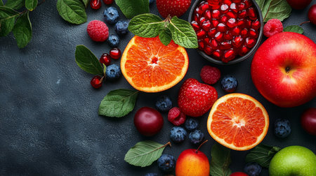 A vibrant flat-lay of assorted fresh fruits and berries, including oranges, apples, and pomegranates, on a dark textured background, highlighting their color and freshness.