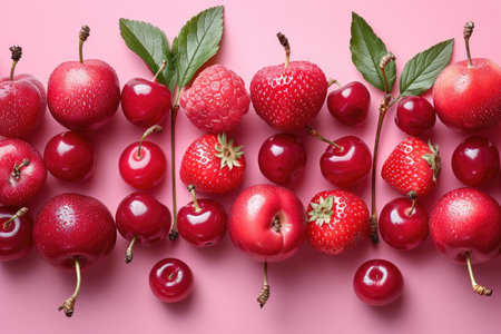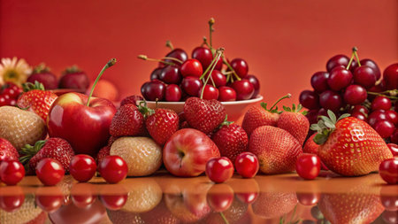 A vibrant arrangement of red fruits including strawberries, cherries, and apples on a wooden table with a red background.
