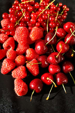 Fresh summer red fruit background composition. Strawberries, red currants, raspberries. Top view, flat lay.