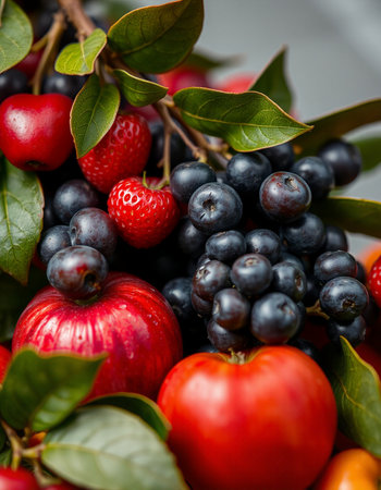A colorful arrangement of fresh apples, ripe berries, and green leaves displayed on a rustic wooden surface