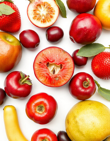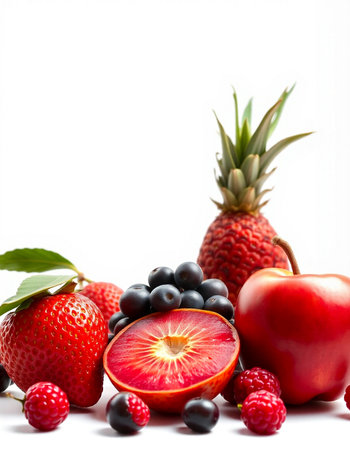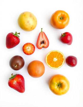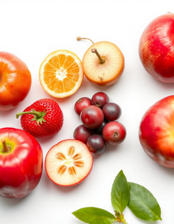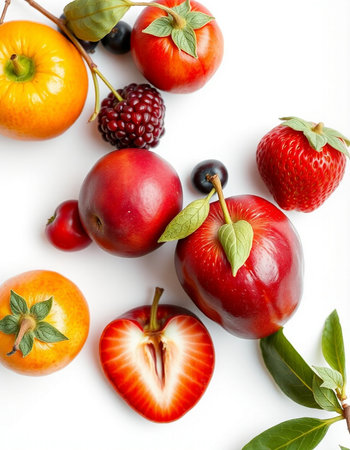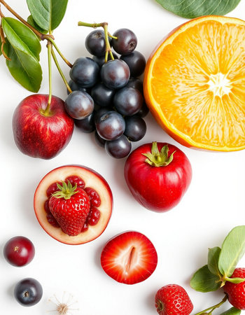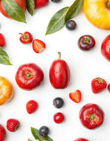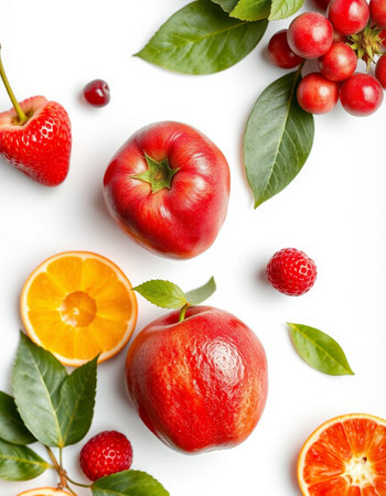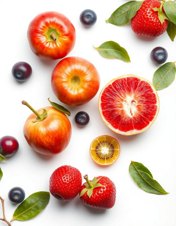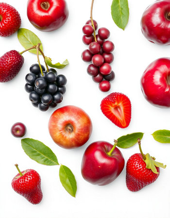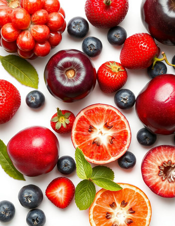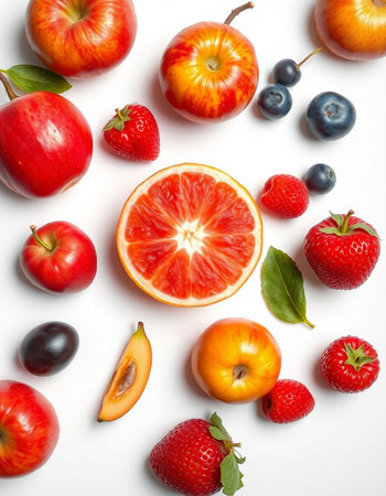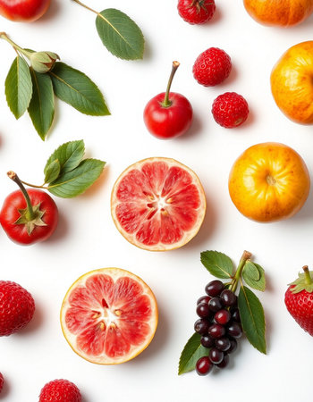 Selection of delicious fruits and berries arranged in a visually appealing pattern on white