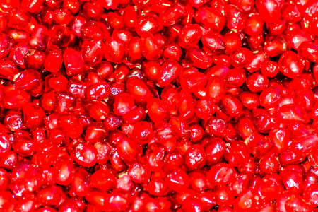 Red ripe and juicy seeds of fresh pomegranate fruit close-up. Macro