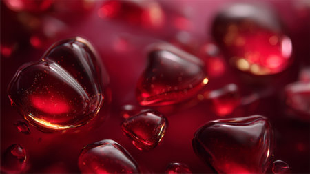 This image showcases a close-up perspective of shimmering red heart-shaped gelatin candies on a glossy surface, perfect for romantic themes and sweet culinary delights.