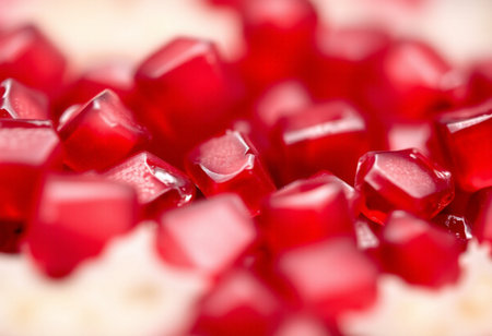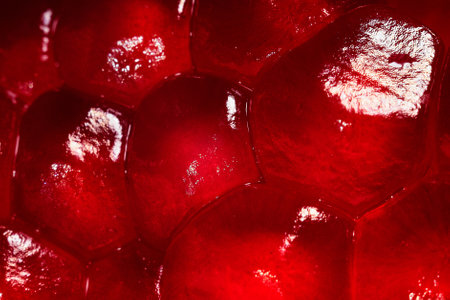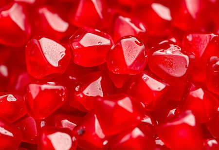 Pomegranate seeds close-up with deep red tones, macro photography. Natural texture and freshness concept
