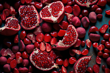 Close up of fresh organic pomegranate seeds background top view, by ai generative