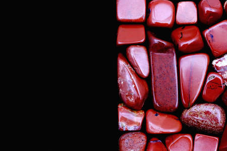 Red jasper heap up jewel stones texture on black background