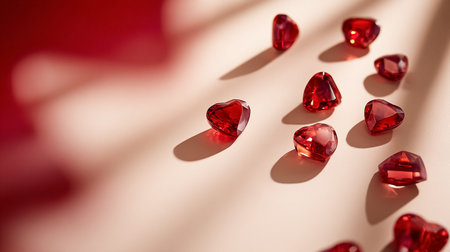 Red crystal hearts sparkling on a beige surface with delicate light and shadow play, representing love, romance, and luxury