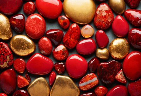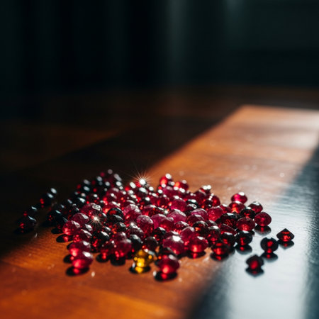 This captivating image features vibrant red gems scattered on a glossy surface, showcasing stunning reflections and intricate details, perfect for creative designs.